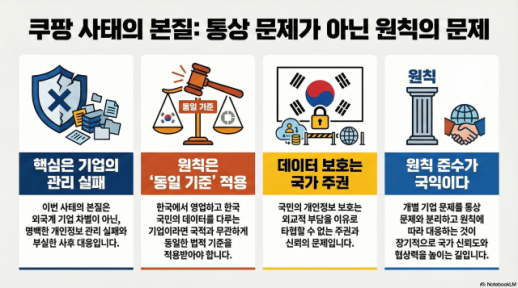쿠팡의 대규모 개인정보 유출 사태를 둘러싼 논란이 통상 이슈로 비화할지 이목이 쏠리고 있다. 미국을 방문한 여한구 통상교섭본부장이 해당 사안을 통상·외교 문제와 분리해 대응해야 한다고 밝힌 것은 그래서 시의적절하다. 문제의 성격을 흐리지 않겠다는 원칙 선언이기 때문이다. 이번 사안의 본질은 명확하다. 기업의 개인정보 관리 실패와 그 이후 대응의 부실이다. 이는 책임의 문제다. 한국에서 영업하고 한국 국민의 데이터를 다루는 기업이라면 동일한 기준을 적용받는 것이 상식이다. 이를 미국 기업에 대한 차별로