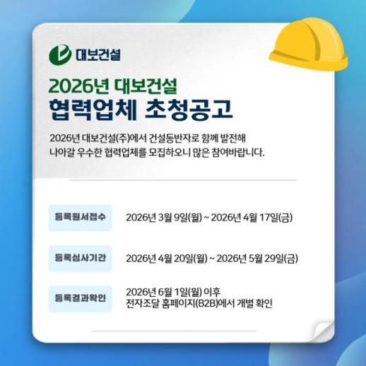 대보건설의 2026년 협력업체 모집은 외주 부문과 자재 부문으로 나눠 진행된다.