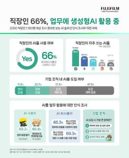한국후지필름비즈니스이노베이션(이하 한국후지필름BI)이 지난 9월 18일부터 9월 30일까지 20대부터 50대 직장인 1,180명을 대상으로 실시한 ‘직장인 AI·AX 솔루션 인식 조사’ 결과를 발표했다. 이번 조사는 AI 기술이 업무 현장에 어떤 방식으로 도입·활용되고 있는지와 이에 대한 직장인들의 인식을 알아보기 위해 실시됐다.