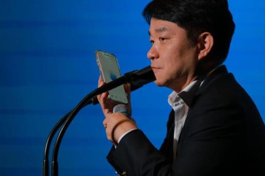 이경전 경희대학교 교수가 24일 서울 중구 플라자호텔에서 열린 ‘제17회 착한 성장, 좋은 일자리 글로벌포럼(2025 GGGF)’에서 발표를 진행하면서 챗GPT와 대화를 나누고 있다.