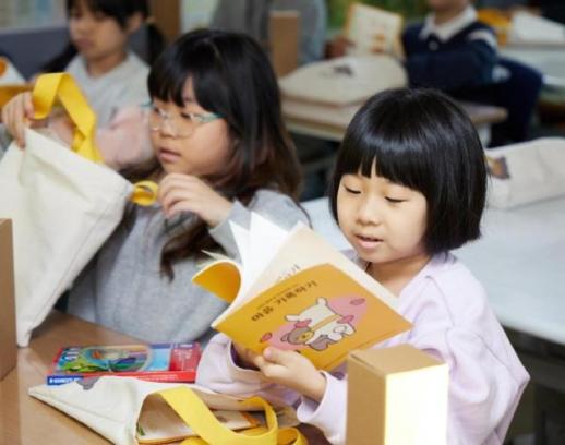 어린이들이 KB손해보험으로부터 받은 물품들을 열어보고 있다.