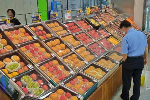 한 소비자가 롯데마트 제타플렉스 서울역점에서 과일 선물세트를 살펴보고 있다.