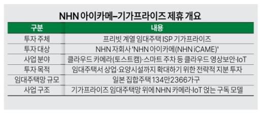 NHN이 일본 임대주택 134만 가구를 상대로 자사 클라우드 카메라와 IoT(사물인터넷) 서비스를 공급할 수 있는 발판을 마련했다. 일본 상장 통신·플랫폼 그룹 프리빗(FreeBit) 계열 임대주택 인터넷 사업자 기가프라이즈(GigaPrize)가 NHN 자회사 ‘NHN 아이카메(NHN iCAME)’에 전략적 지분 투자를 단행하면서, 자사가 관리하는 임대주택 인터넷망 위 핵심 클라우드