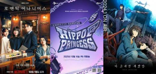 왼쪽부터 한·일 합작 드라마 '로맨틱 어나니머스', 예능 '언프리티 랩스타 : 힙팝 프린세스', 애니 '나 혼자만 레벨업' 포스터