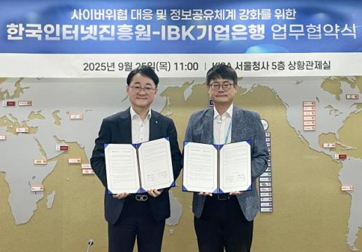 IBK기업은행은 한국인터넷진흥원과 ‘사이버위협 대응 및 정보 공유 체계 강화를 위한 업무협약’을 체결했다고 26일 밝혔다.