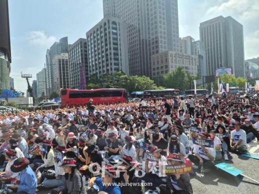 금융노조가 26일 서울 광화문 세종대로에서 총파업 집회를 열고 있다.
