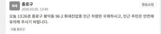종로구 봉익동서 화재 발생…"차량 우회" 서울시 종로구에서 화재가 발생했다. 5일 종로구는 안전재난문자를 통해 "오늘 오후 1시 26분경 종로구 봉익동에서 화재가 발생했다"며 "인근 차량은 우회하시고, 인근 주민은 안전에 유의해 주시기 바란다"고 밝혔다. 2026-03-05 13:43:04 -
