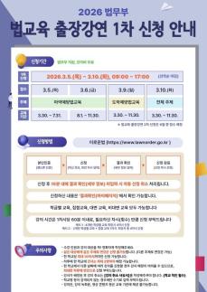 법무부, 청소년 법교육 출장강연 5일부터 접수 법무부는 5일부터 청소년들이 법과 인권의 가치를 배우고 민주 시민으로 성장할 수 있도록 지원하는 '청소년 법 교육 출장 강연' 1차 접수를 시작한다. 이번 교육은 법무부 장관이 위촉한 법 교육 전문 강사가 전국 초·중·고등학교를 방문해 학생들의 눈높이에 맞춰 토론과 발표, 퀴즈 등 참여형 수업으로 진행한다. 강사는 법 교육 전문 강사 양성 과정을 수료하고, 이론과 시연을 평가해 법무부 장관이 위촉한 자로 청소년 및 일반 국민 대상으로 법 교육을 할 수 있다. 법무부는 올해 사 2026-03-04 10:41:38 -