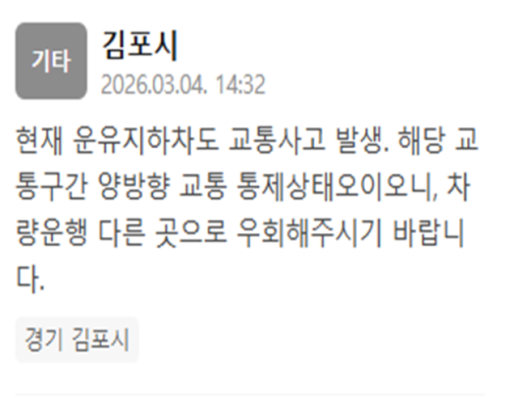 김포시 운유지하차도 차량 통제 해제…"운행 가능" 교통사고로 인해 차량이 통제됐던 경기 김포시 운유지하차도가 차량 운행을 재개했다. 김포시는 4일 오후 2시 51분께 "운유지하차도 차량 통제가 해제돼 다시 차량 운행이 가능하다"는 내용의 재난문자를 발송했다. 앞서 김포시는 이날 오후 2시 32분께 "현재 운유지하차도 교통사고가 발생해 해당 교통구간이 양방향 통제되고 있다"며 "차량 운행은 다른 곳으로 우회해달라"고 당부한 바 있다. 2026-03-04 14:55:34 -