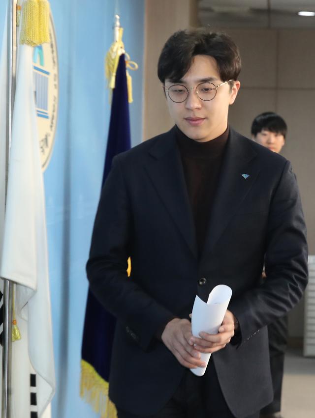 미투 논란이 제기된 더불어민주당 2번째 영입인재인 원종건씨가 28일 서울 여의도 국회 정론관에서 영입인재 자격을 자진 반납하겠다고 밝힌 뒤 회견장을 나서고 있다. [사진=연합뉴스 제공]