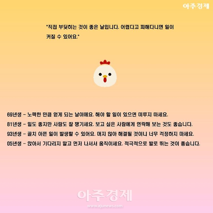 ▶닭띠 오늘의 운세 "직접 부딪히는 것이 좋은 날입니다. 어렵다고 피해다니면 일이 커질 수 있어요."