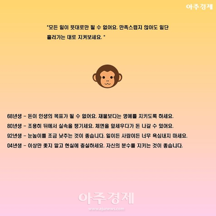 ▶원숭이띠 오늘의 운세 "모든 일이 뜻대로만 될 수 없어요. 만족스럽지 않아도 일단 흘러가는 대로 지켜보세요. "