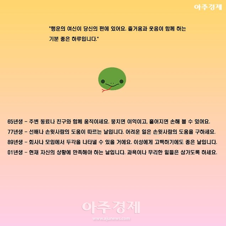 ▶뱀띠 오늘의 운세  "행운의 여신이 당신의 편에 있어요. 즐거움과 웃음이 함께 하는 기분 좋은 하루입니다."