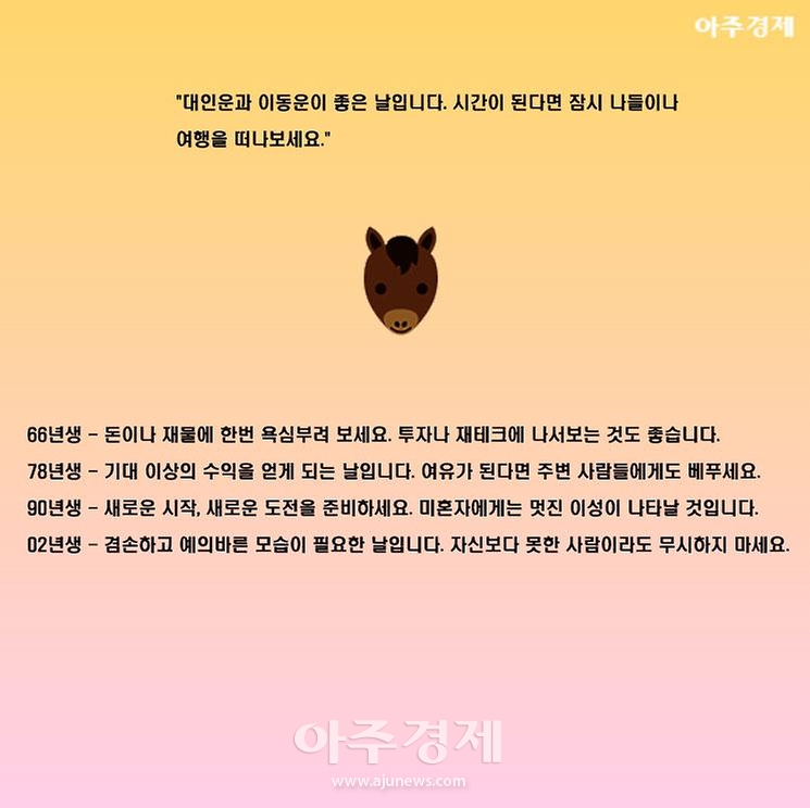 ▶말띠 오늘의 운세 "대인운과 이동운이 좋은 날입니다. 시간이 된다면 잠시 나들이나 여행을 떠나보세요."