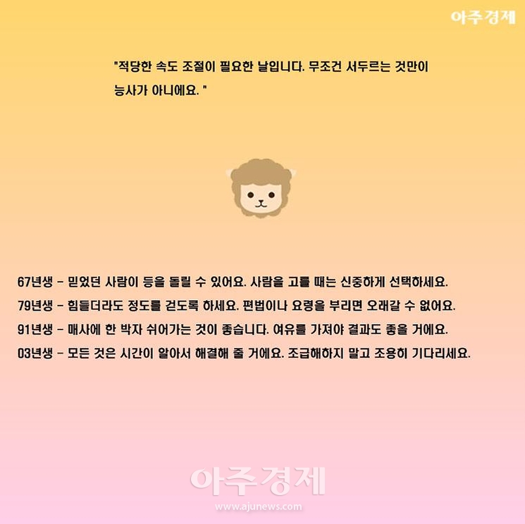 ▶양띠 오늘의 운세 "적당한 속도 조절이 필요한 날입니다. 무조건 서두르는 것만이 능사가 아니에요. "