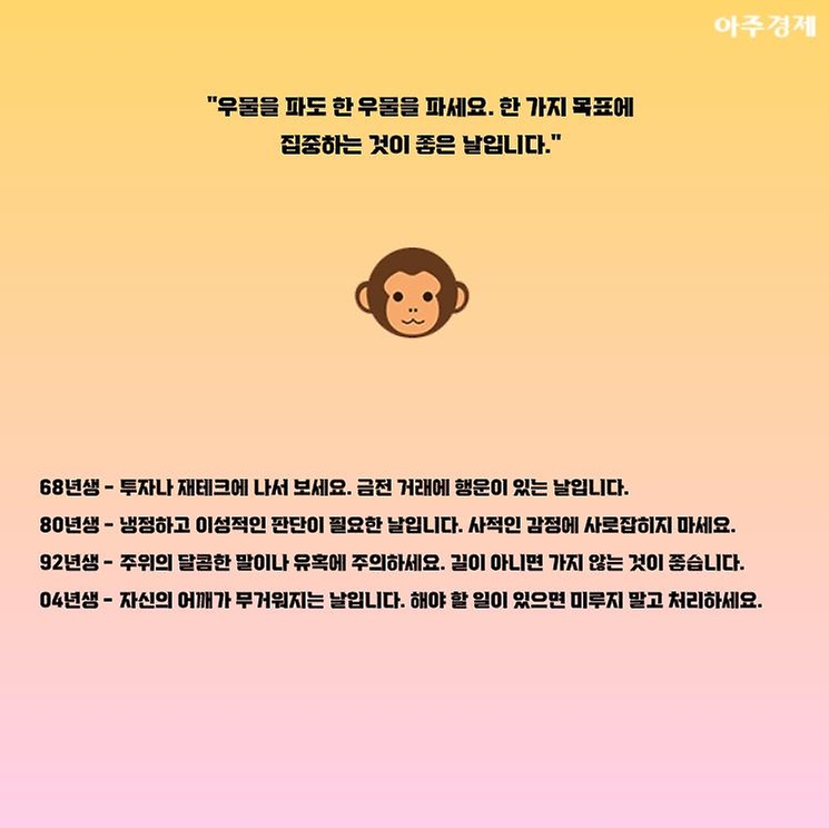 ▶원숭이띠 오늘의 운세 "우물을 파도 한 우물을 파세요. 한 가지 목표에 집중하는 것이 좋은 날입니다."