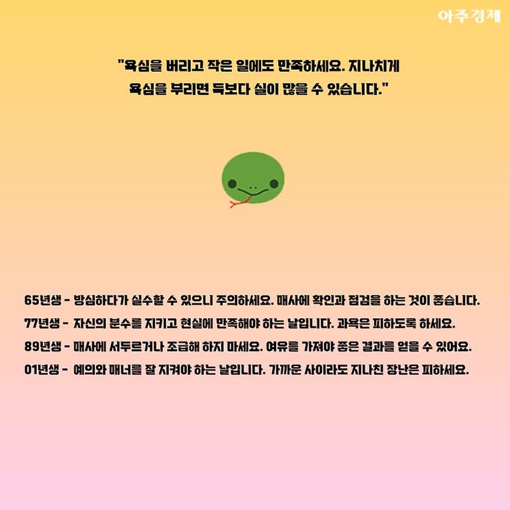 ▶뱀띠 오늘의 운세 "욕심을 버리고 작은 일에도 만족하세요. 지나치게 욕심을 부리면 득보다 실이 많을 수 있습니다."