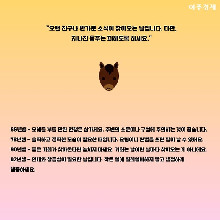 ▶말띠 오늘의 운세 "오랜 친구나 반가운 소식이 찾아오는 날입니다. 다만, 지나친 음주는 피하도록 하세요."