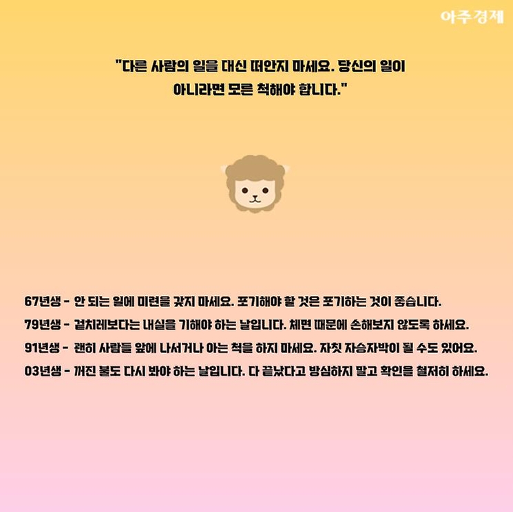 ▶양띠 오늘의 운세 "다른 사람의 일을 대신 떠안지 마세요. 당신의 일이 아니라면 모른 척해야 합니다."