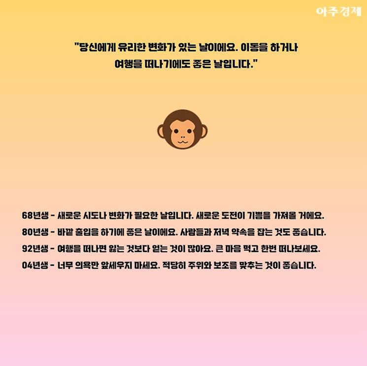 ▶원숭이띠 오늘의 운세 "당신에게 유리한 변화가 있는 날이에요. 이동을 하거나 여행을 떠나기에도 좋은 날입니다."