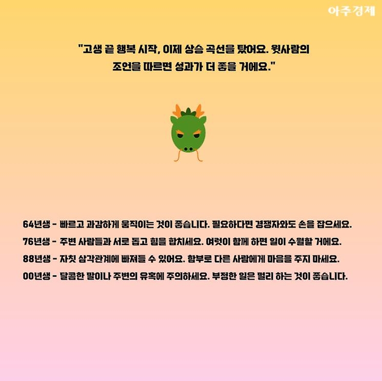 ▶용띠 오늘의 운세 "고생 끝 행복 시작, 이제 상승 곡선을 탔어요. 윗사람의 조언을 따르면 성과가 더 좋을 거에요."