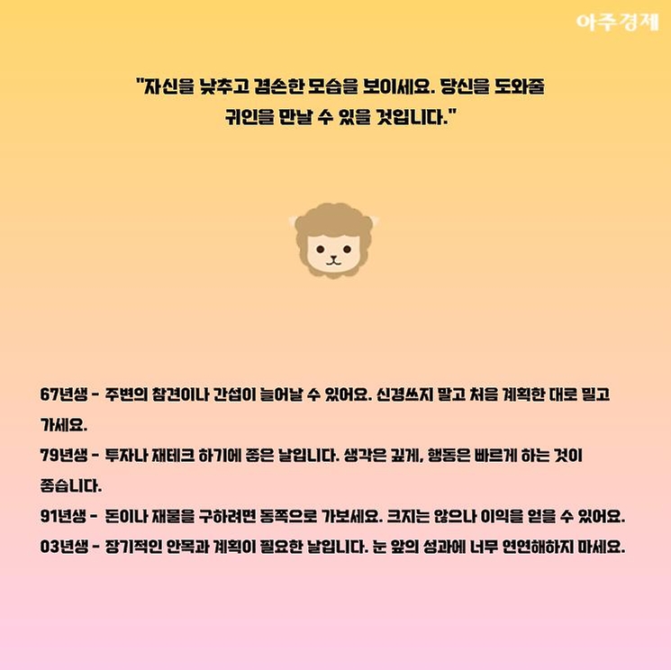 ▶양띠 오늘의 운세 "자신을 낮추고 겸손한 모습을 보이세요. 당신을 도와줄 귀인을 만날 수 있을 것입니다."