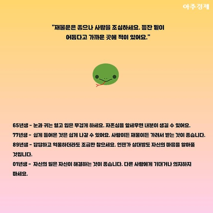 ▶뱀띠 오늘의 운세 "재물운은 좋으나 사람을 조심하세요. 등잔 밑이 어둡다고 가까운 곳에 적이 있어요."