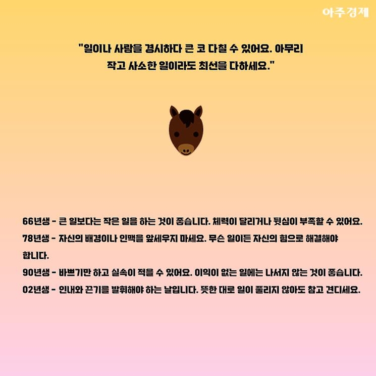 ▶말띠 오늘의 운세 "일이나 사람을 경시하다 큰 코 다칠 수 있어요. 아무리 작고 사소한 일이라도 최선을 다하세요."