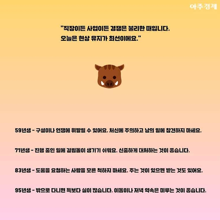 ▶돼지띠 오늘의 운세 "들어오는 돈보다 나가는 돈이 많은 날입니다. 괜히 밤늦게 밖으로 돌아다니지 마세요."