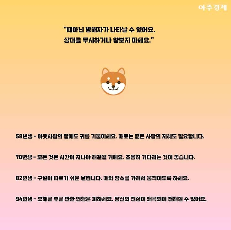 ▶개띠 오늘의 운세 "금전운이 좋으니 지갑이 두둑한 날입니다. 가족간에도 화목하니 즐거운 하루예요."