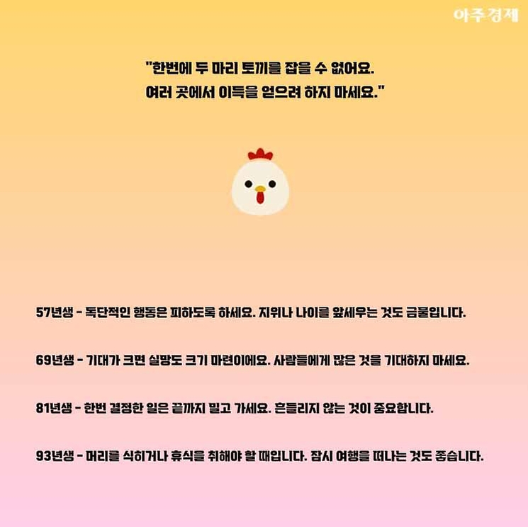 69년생 -옷은 새 옷이 좋지만 사람은 옛사람이 좋아요. 오랜 동료가 행운을 가져올 것입니다.