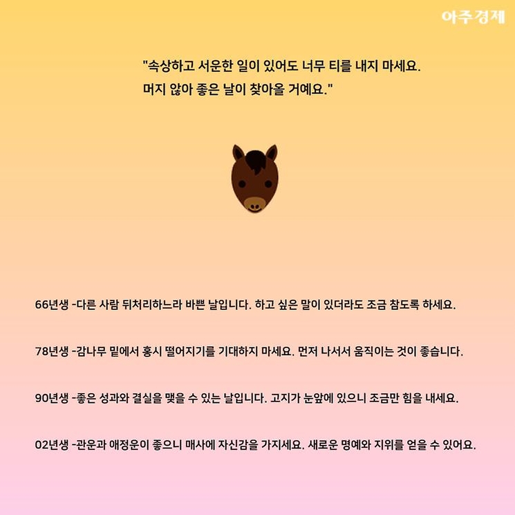 ▶말띠 오늘의 운세 "속상하고 서운한 일이 있어도 너무 티를 내지 마세요. 머지 않아 좋은 날이 찾아올 거에요."