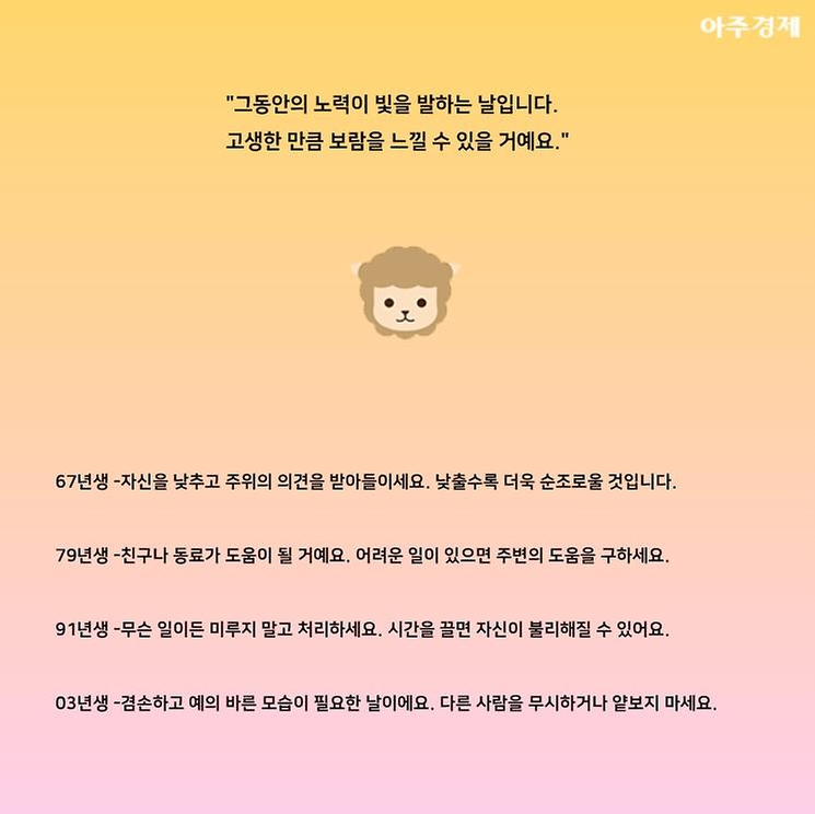 ▶양띠 오늘의 운세 "그동안의 노력이 빛을 발하는 날입니다. 고생한 만큼 보람을 느낄 수 있을 거에요."