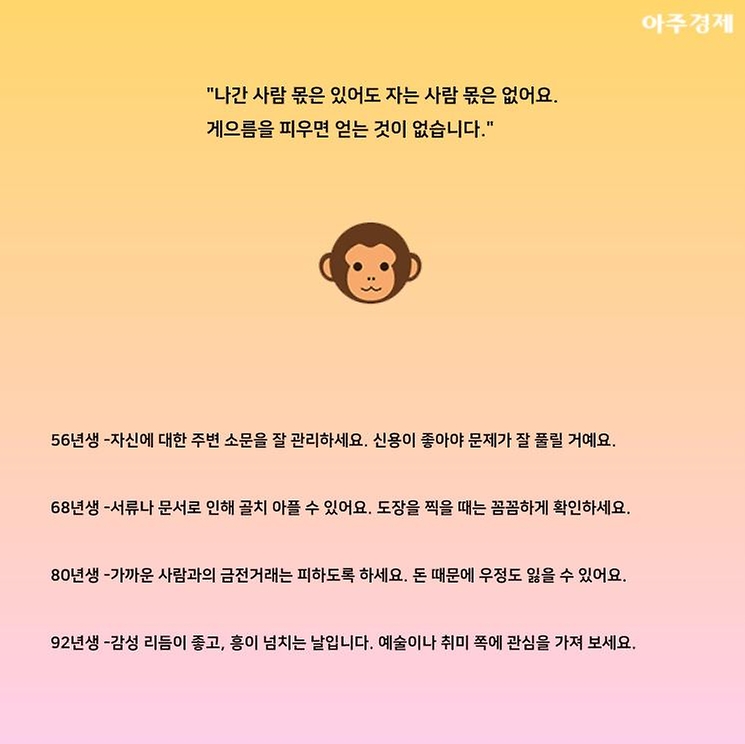 ▶원숭이띠 오늘의 운세 "나간 사람 몫은 있어도 자는 사람 몫은 없어요. 게으름을 피우면 얻는 것이 없습니다."