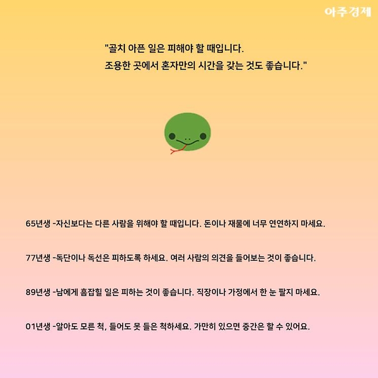 ▶뱀띠 오늘의 운세 "골치아픈 일은 피해야 할 때입니다. 조용한 곳에서 혼자만의 시간을 갖는 것도 좋습니다."