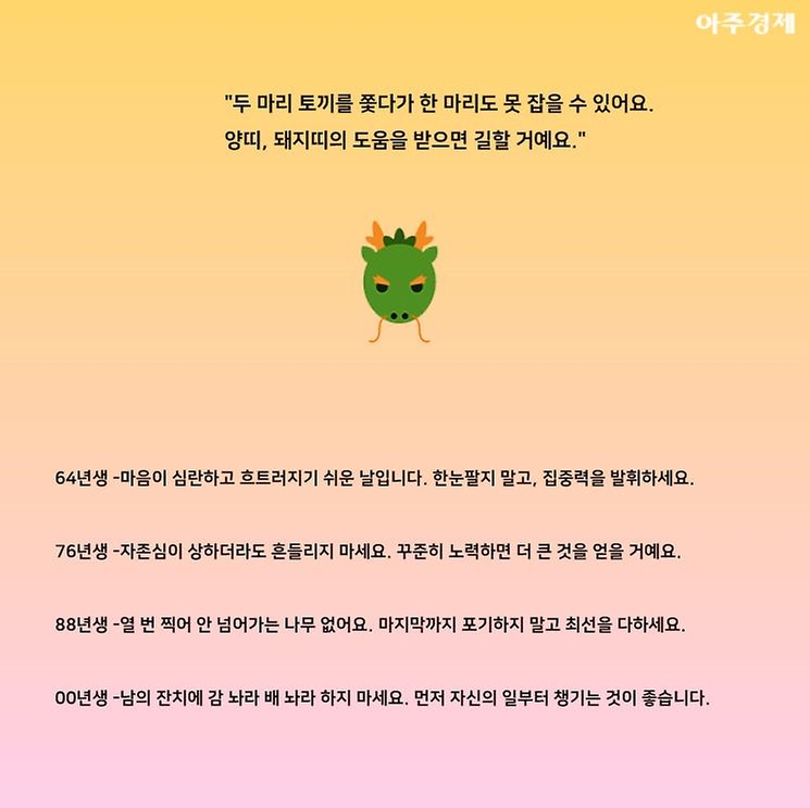 ▶용띠 오늘의 운세 "두 마리 토끼를 쫓다가 한 마리도 못 잡을 수 있어요. 양띠, 돼지띠의 도움을 받으면 길할 거에요."