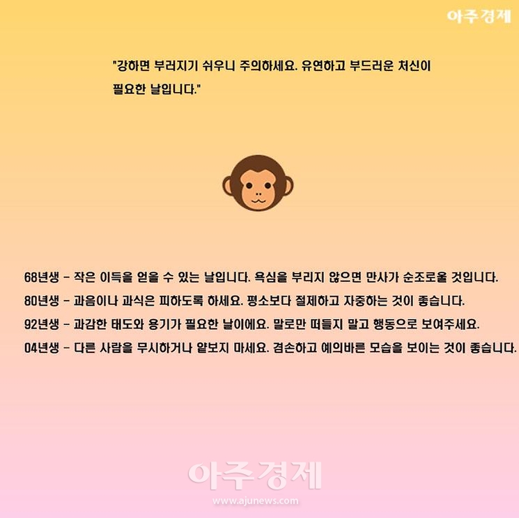 ▶원숭이띠 오늘의 운세 "강하면 부러지기 쉬우니 주의하세요. 유연하고 부드러운 처신이 필요한 날입니다."