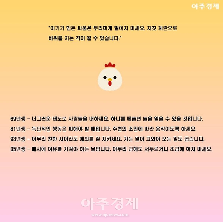 ▶닭띠 오늘의 운세 "이기기 힘든 싸움은 무리하게 벌이지 마세요. 자칫 계란으로 바위를 치는 격이 될 수 있습니다."