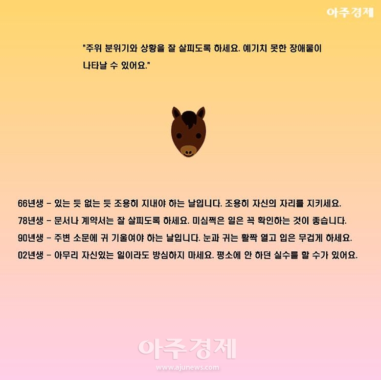 ▶말띠 오늘의 운세 "주위 분위기와 상황을 잘 살피도록 하세요. 예기치 못한 장애물이 나타날 수 있어요."