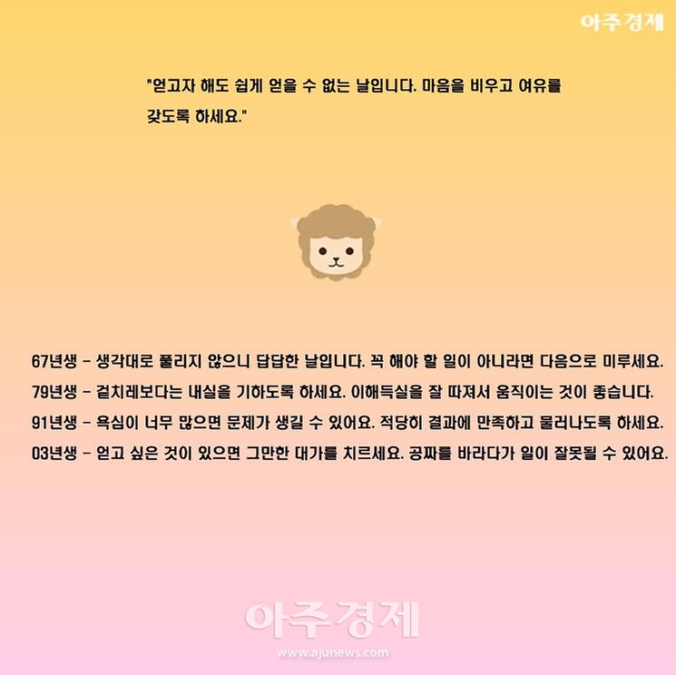 ▶양띠 오늘의 운세 "얻고자 해도 쉽게 얻을 수 없는 날입니다. 마음을 비우고 여유를 갖도록 하세요."