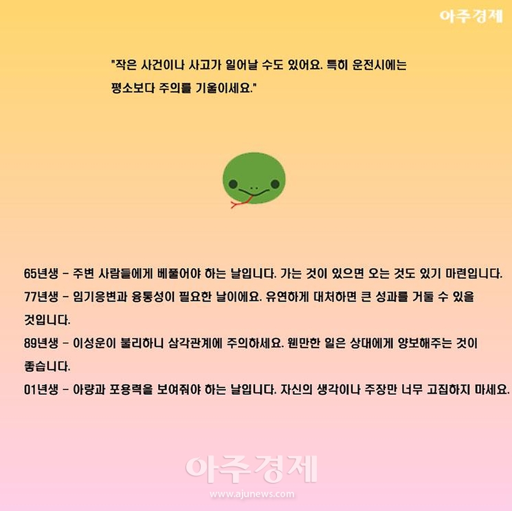 ▶뱀띠 오늘의 운세 "작은 사건이나 사고가 일어날 수도 있어요. 특히 운전시에는 평소보다 주의를 기울이세요."