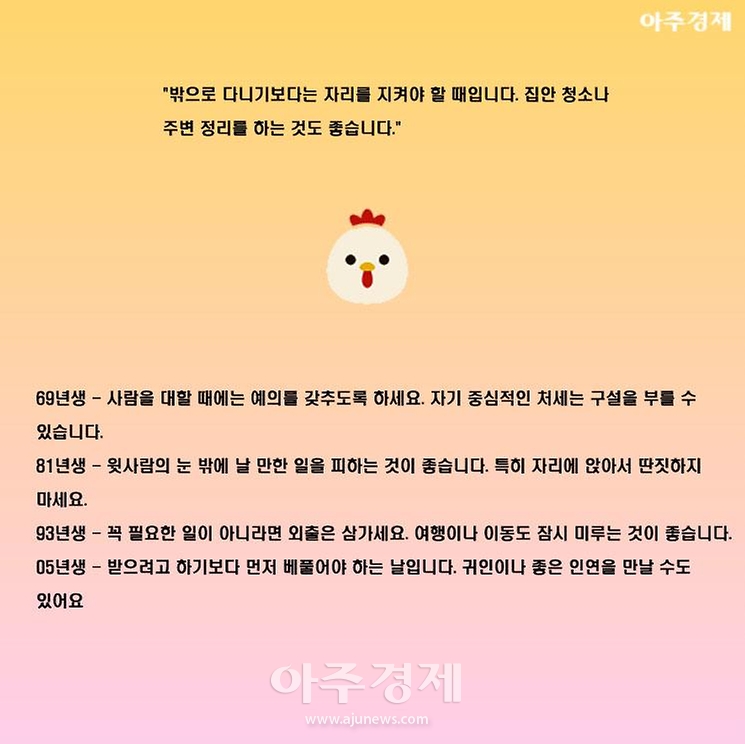 ▶닭띠 오늘의 운세 "밖으로 다니기보다는 자리를 지켜야 할 때입니다. 집안 청소나 주변 정리를 하는 것도 좋습니다."