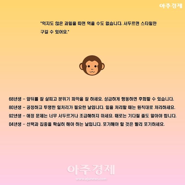 ▶원숭이띠 오늘의 운세 "익지도 않은 과일을 따면 먹을 수도 없습니다. 서두르면 스타일만 구길 수 있어요."