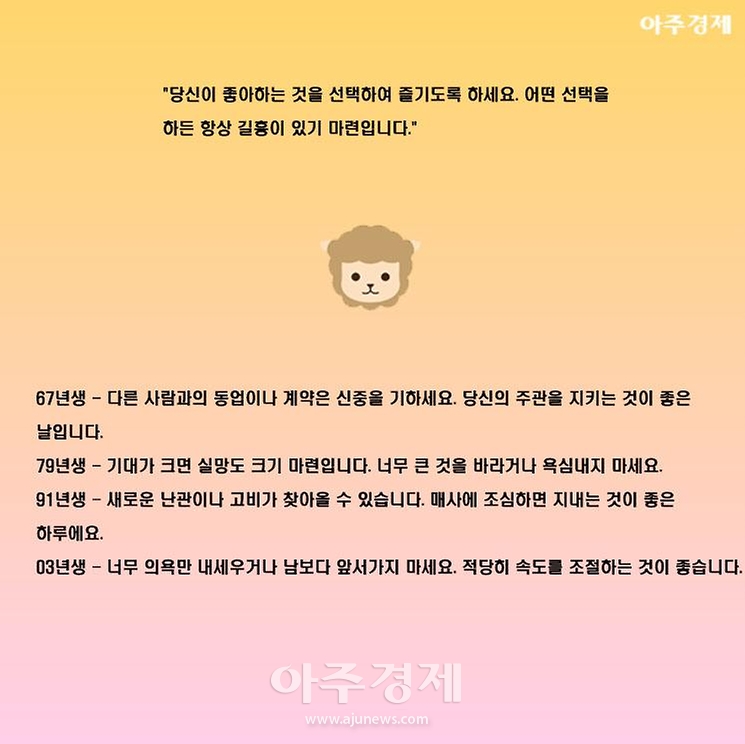 ▶양띠 오늘의 운세 "당신이 좋아하는 것을 선택하여 즐기도록 하세요. 어떤 선택을 하든 항상 길흉이 있기 마련입니다."