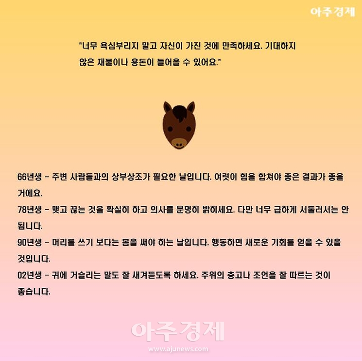 ▶말띠 오늘의 운세 "너무 욕심부리지 말고 자신이 가진 것에 만족하세요. 기대하지 않은 재물이나 용돈이 들어올 수 있어요."