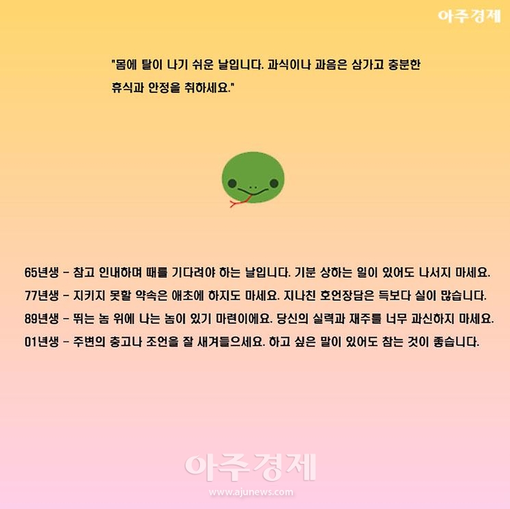 ▶뱀띠 오늘의 운세  "몸에 탈이 나기 쉬운 날입니다. 과식이나 과음은 삼가고 충분한 휴식과 안정을 취하세요."