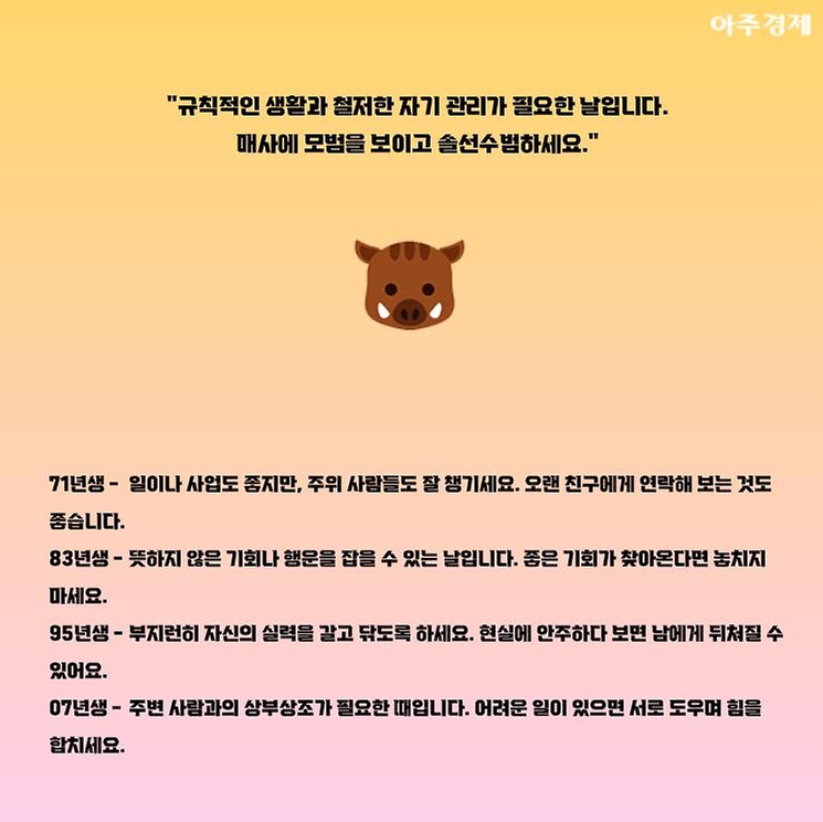 ▶돼지띠 오늘의 운세 "규칙적인 생활과 철저한 자기 관리가 필요한 날입니다. 매사에 모범을 보이고 솔선수범하세요."