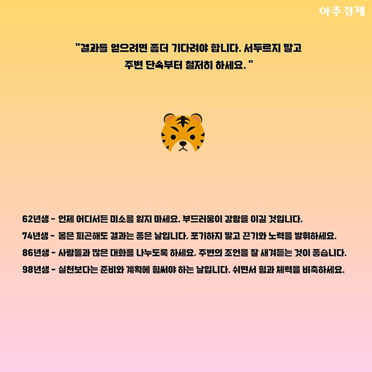 ▶호랑이띠 오늘의 운세 "결과를 얻으려면 좀더 기다려야 합니다. 서두르지 말고 주변 단속부터 철저히 하세요. "