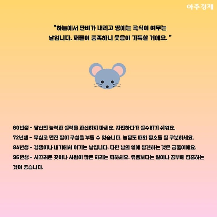 ▶쥐띠 오늘의 운세 "하늘에서 단비가 내리고 땅에는 곡식이 여무는 날입니다. 재물이 풍족하니 웃음이 가득할 거에요. "