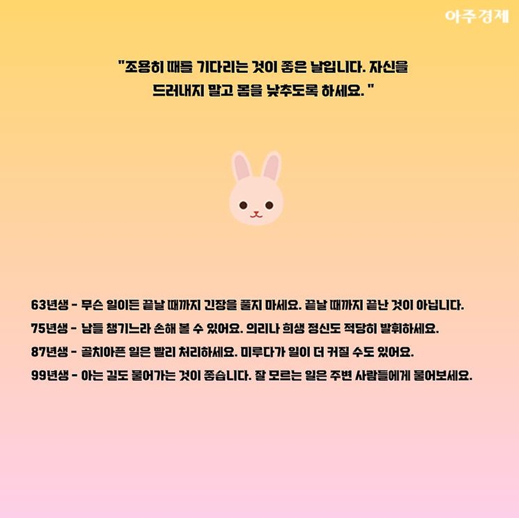 ▶토끼띠 오늘의 운세 "조용히 때를 기다리는 것이 좋은 날입니다. 자신을 드러내지 말고 몸을 낮추도록 하세요. "